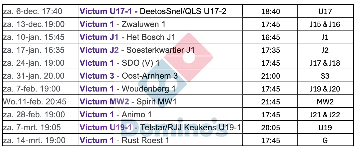 | Datum | Wedstrijd | Bezorgtijd domino’s |